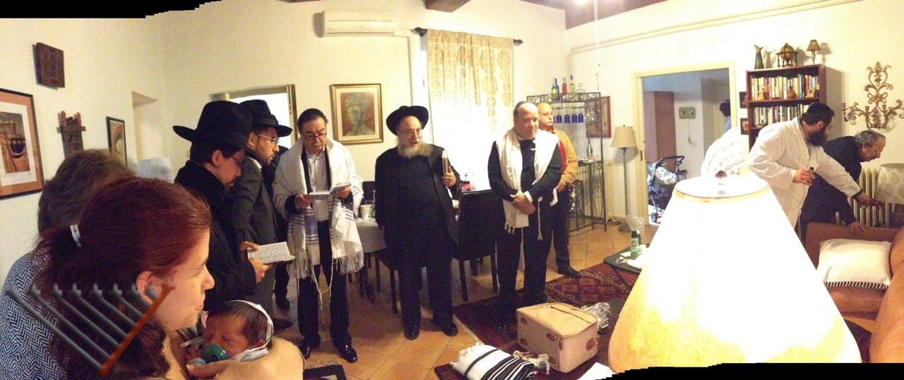 Thanks to the help of the grandmother who came from the States, Mrs. Rivkie Lazar who prepared the refreshments in american style and thanks to Mr. Vito Arbib who organized a quorum of ten men on his own initiative on a very short notice at midday, the ceremony which took place at their home in the center of Rome, was beautiful in all ways, from the spiritual aspect to the food. The newborn was named Yitzchok Aizik. Chabad dedicated a Shabbat meal in his honor.