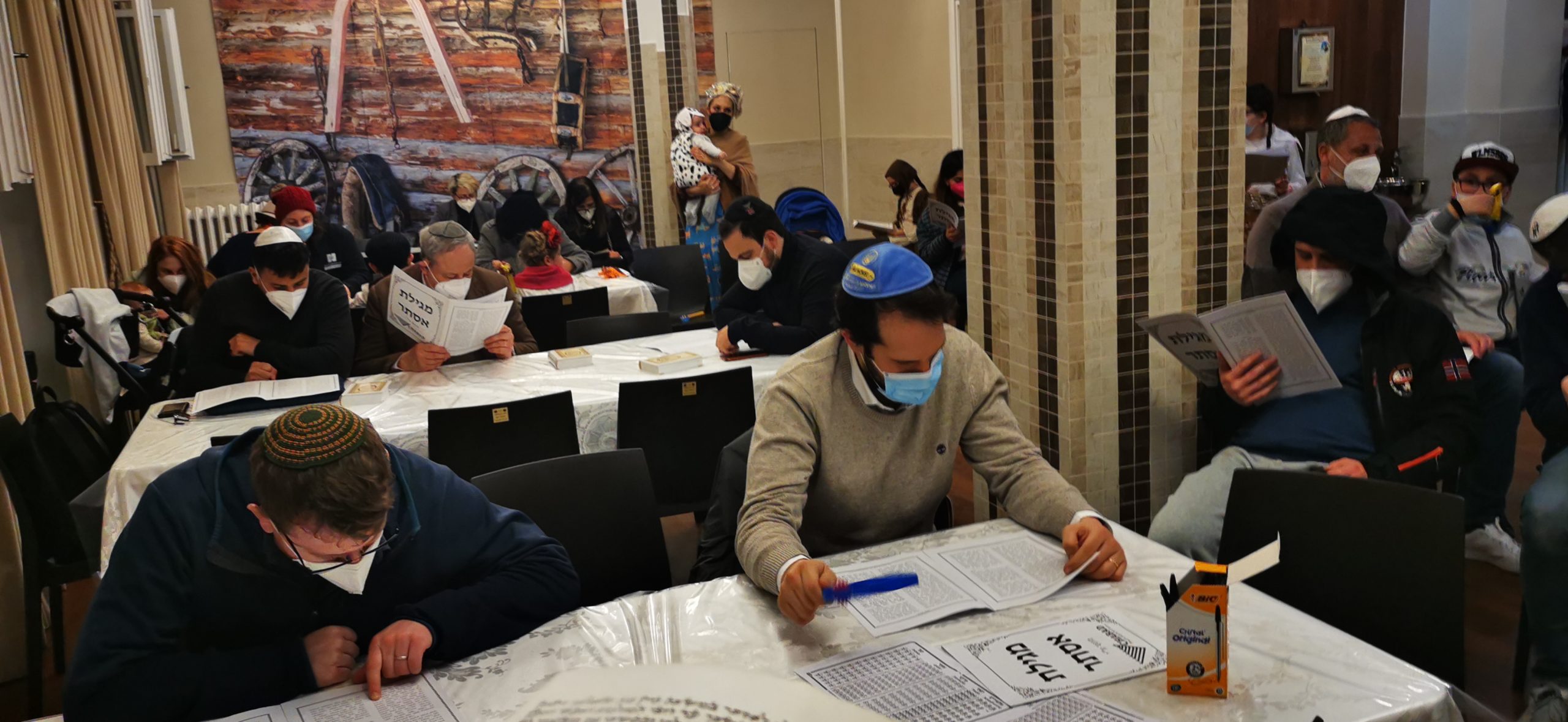 כמה משפחות שהיו בבידוד זכו לשמוע את המגילה הודות לבחור מענדל שטיין שהובא במיוחד לרומא בפורים.
