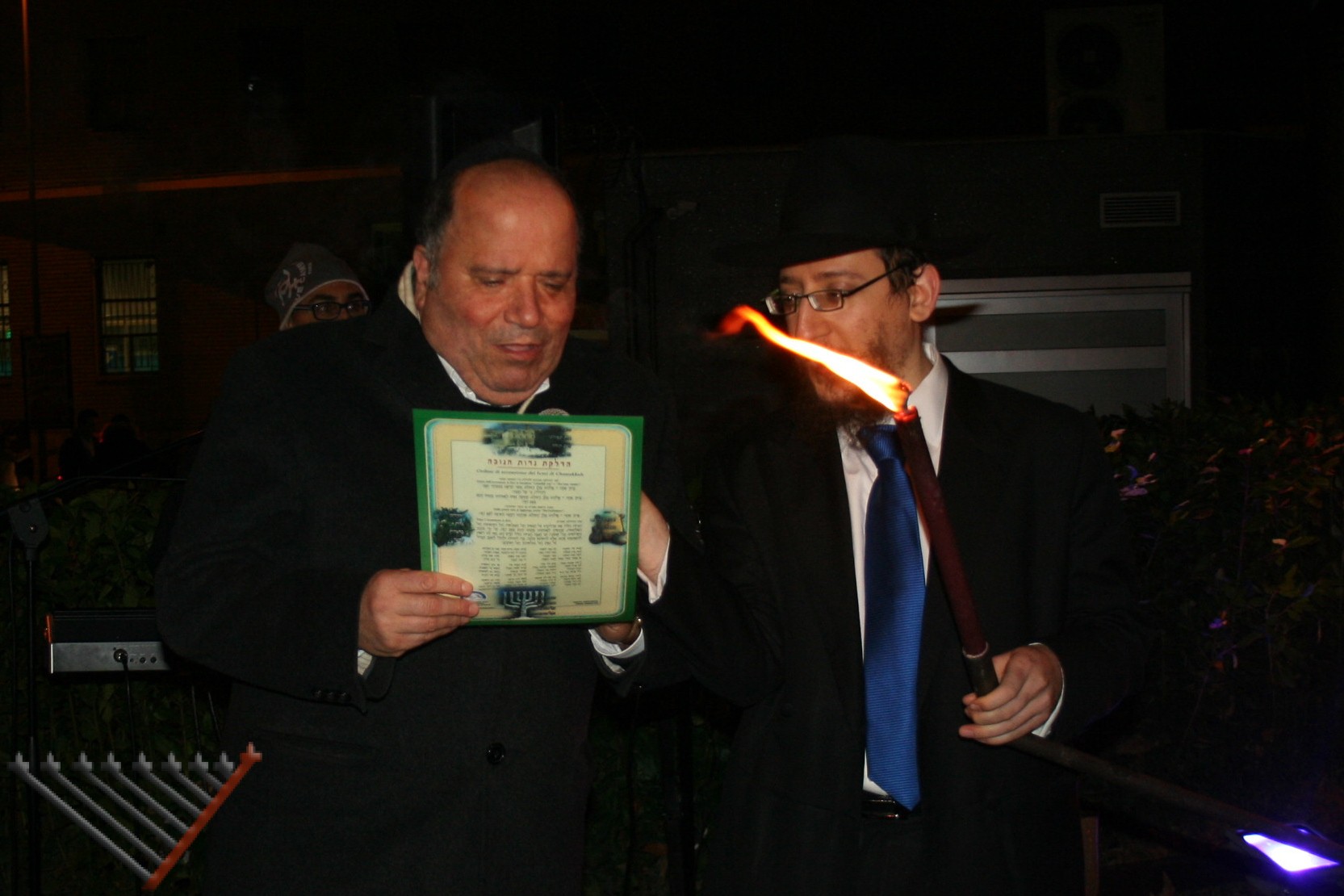 Le benedizioni e la prima candela sono state rivolte da Tino Tesciuba in memoria di suo padre Vittorio Tesciuba Terbasch z”l, la seconda candela da Roby Sassun in memoria della madre Wilma Sassun nata Guetta z”l, la terza candela da Slmone Kahlun, la quarta candela da Emanuele Rubin per la guarigione di Giuliana Masala Kahlun e la quinta candela da Raffi Sassun in memoria del padre Mevorach.