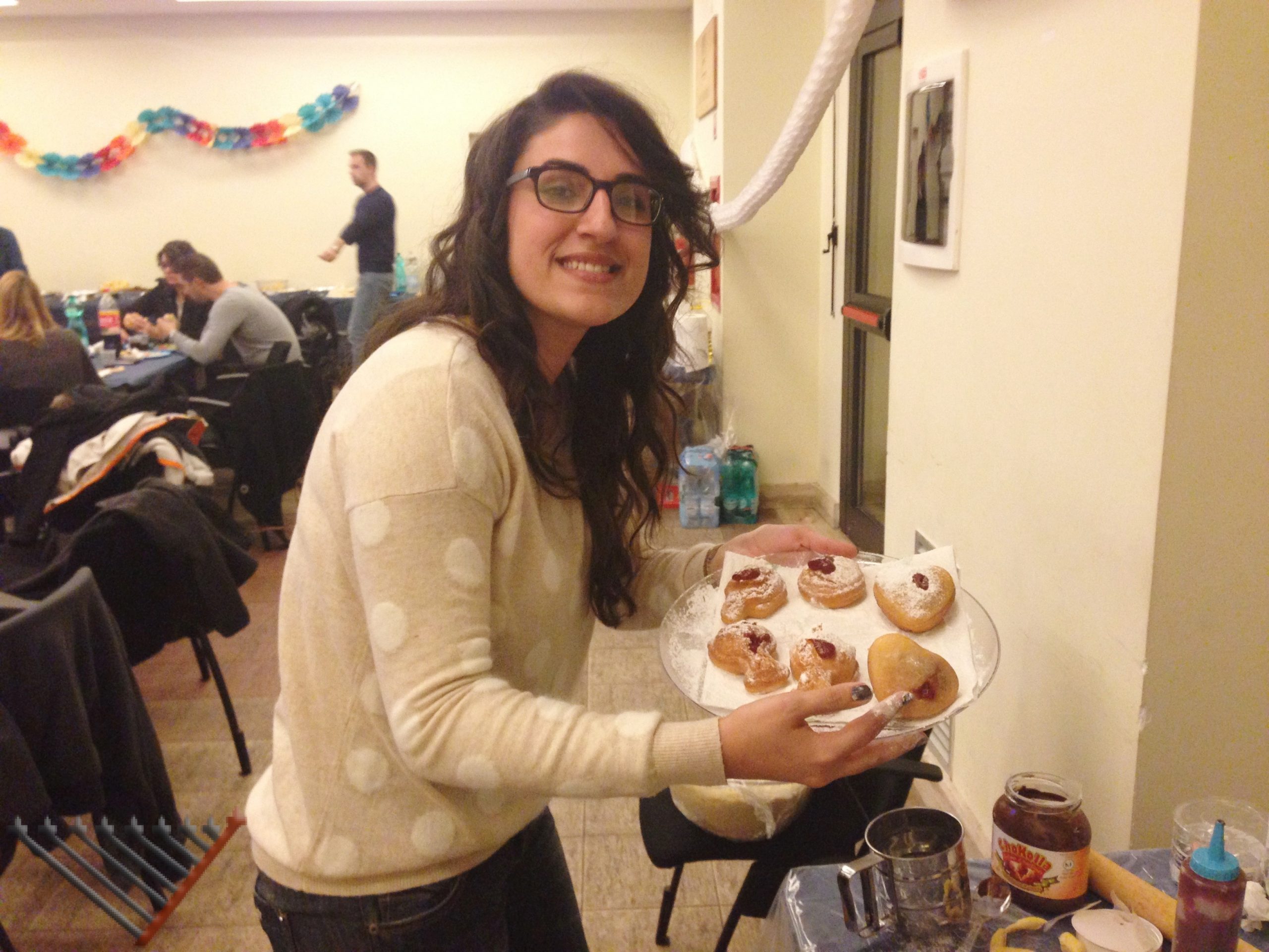 Decine di ragazzi stranieri che studiano a Roma hanno partecipato alla festa di Chanukah in stile israeliano, durante la quale sono stati serviti falafel e pita, krapfen e latkes.