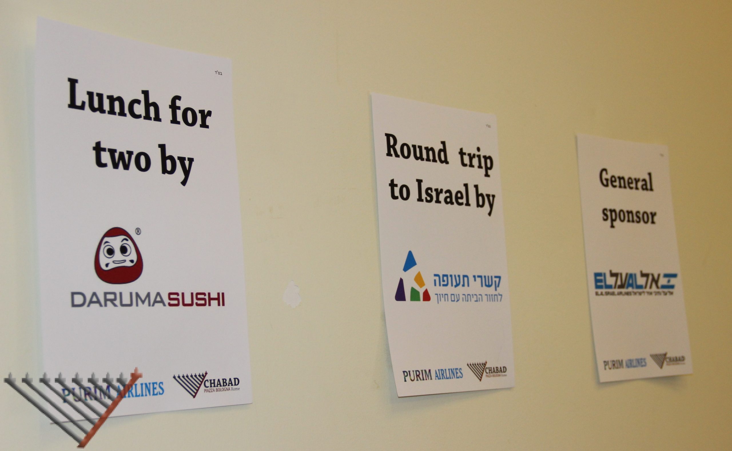 Per tutti coloro che hanno ascoltato la lettura della Meghillà è stata offerta la possibilità di partecipare a una lotteria, che metteva in palio un biglietto aereo, andata e ritorno per Israele, offerto da Kishrei Teufa, e un pranzo per due presso Daruma Sushi. Cheryl Rosenberg si è aggiudicata il biglietto aereo, mentre il pranzo per due da Daruma Sushi è stato vinto da Ori Molayem.