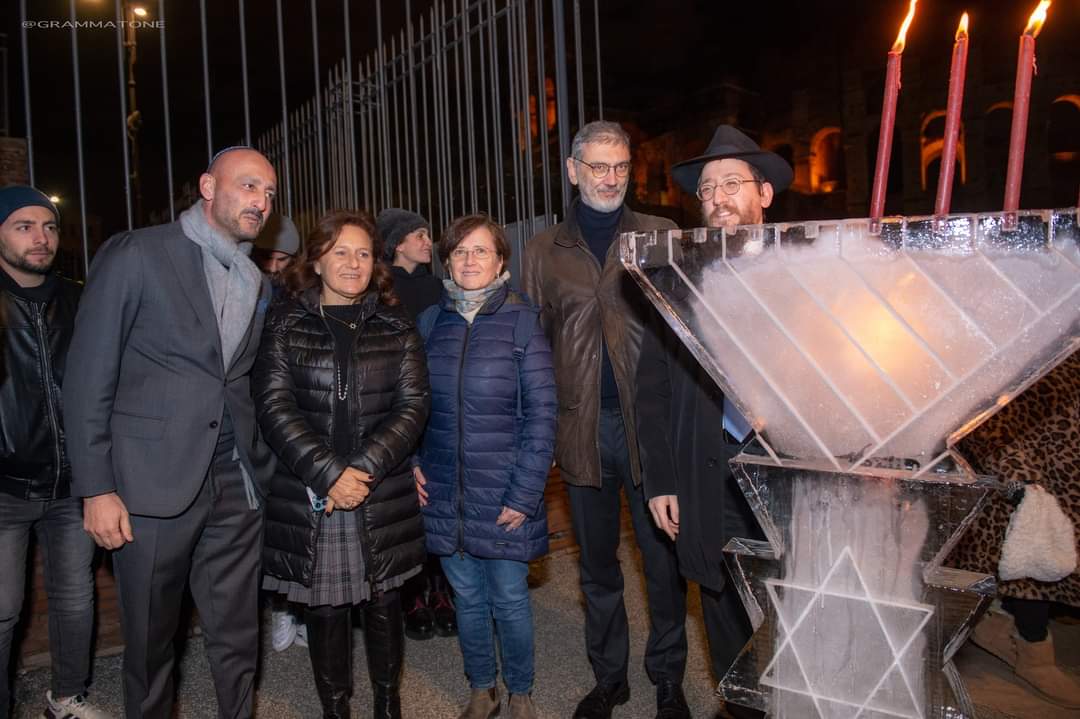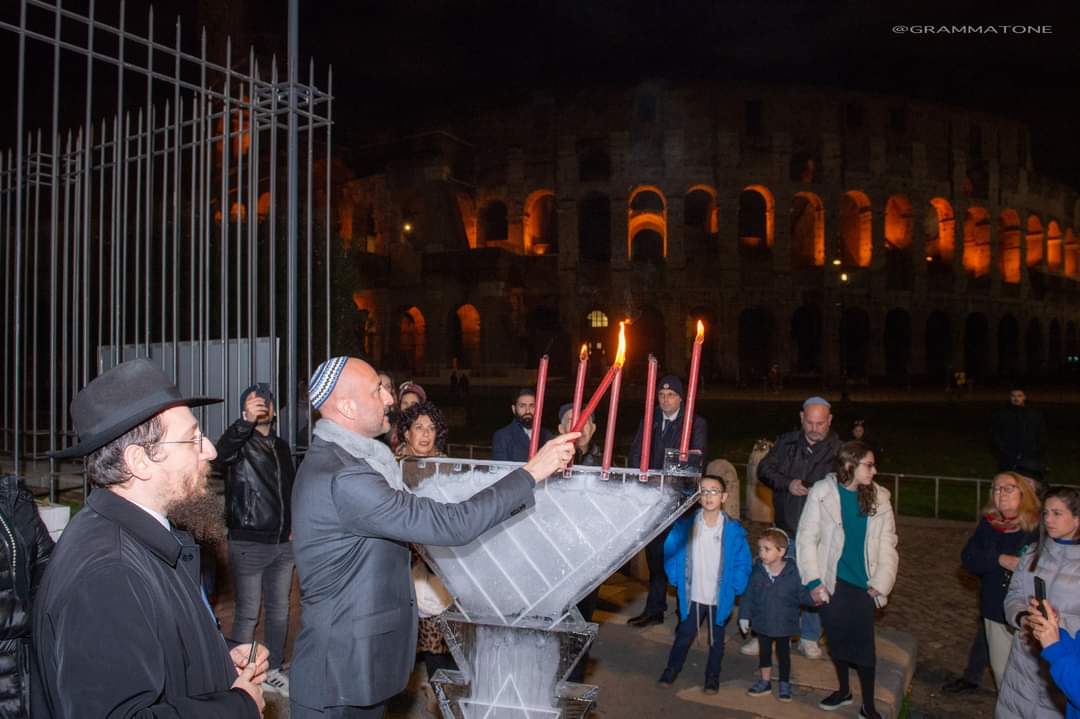 Per il secondo anno, la Chanukià ha illuminato il Colosseo, quest’anno ancora più da vicino, accanto all’Arco di Costantino, non lontano dall’Arco di Tito.