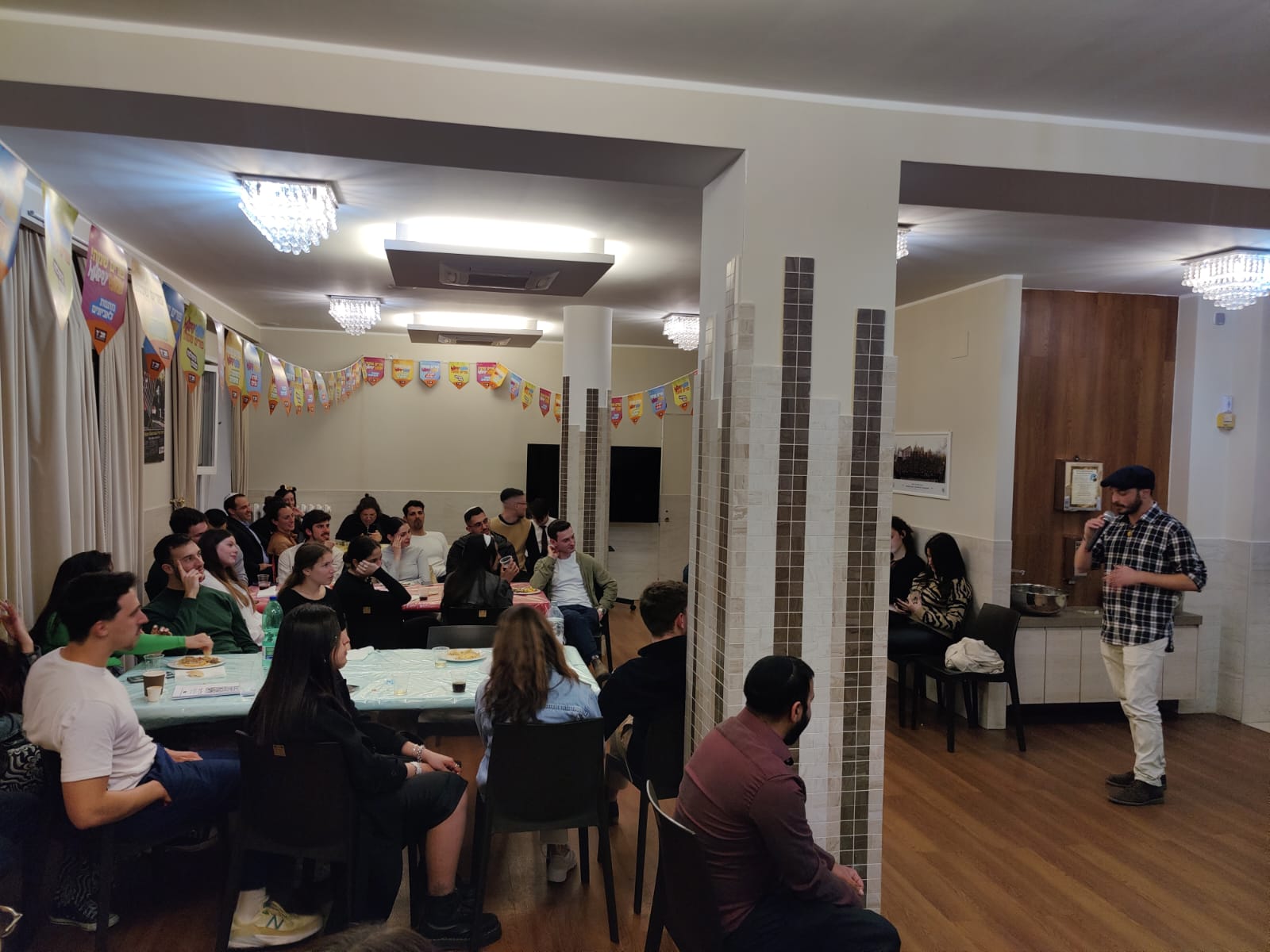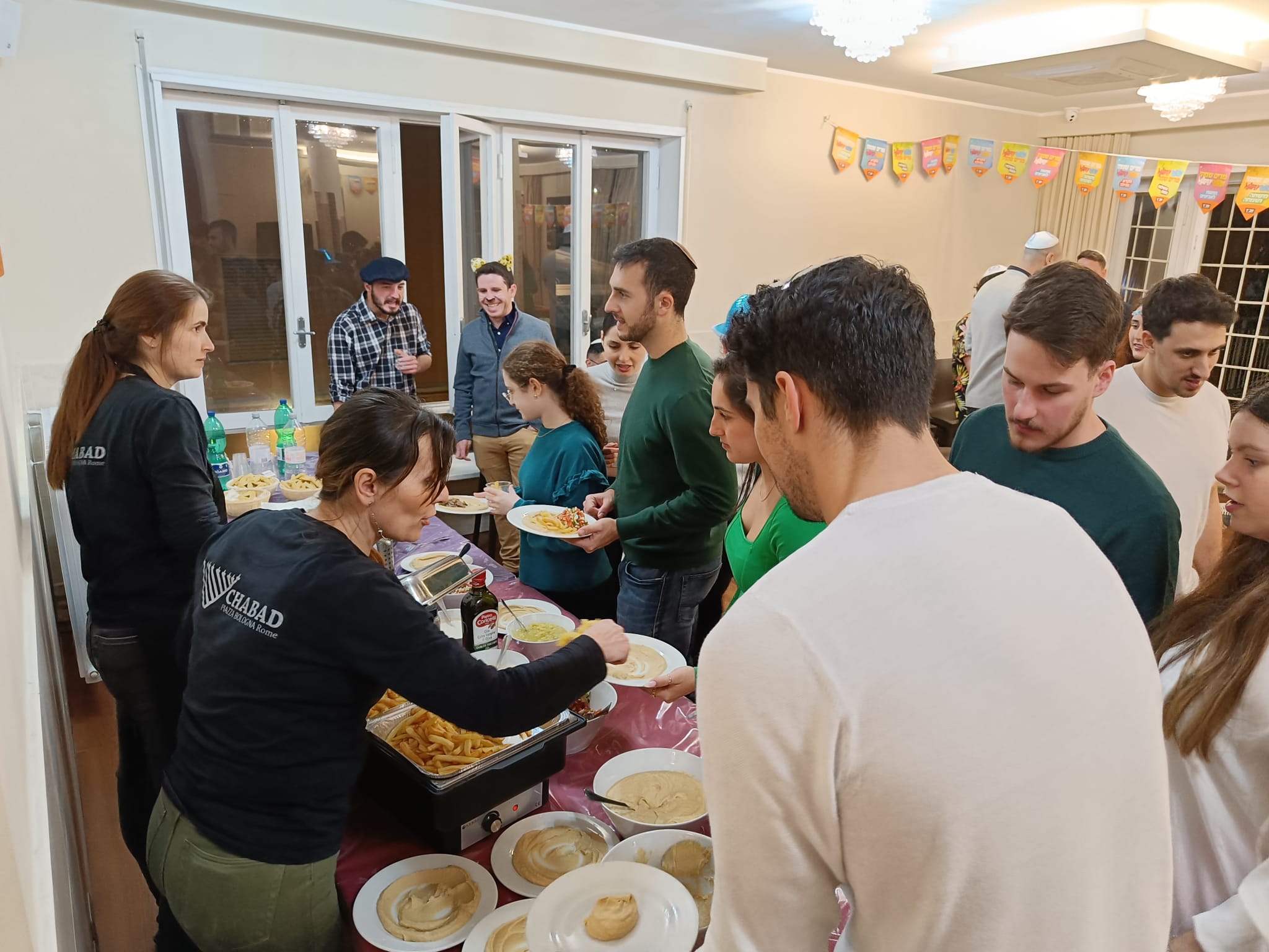 In onore di Purim, il centro Chabad di Piazza Bologna ha organizzato una festa dedicata ai giovani. La serata è stata animata da uno spettacolo di stand-up di Itai Keren e da un buffet che ha deliziato i presenti con prelibatezze della cucina mediorientale, tra cui chummus con carne o funghi e pita.