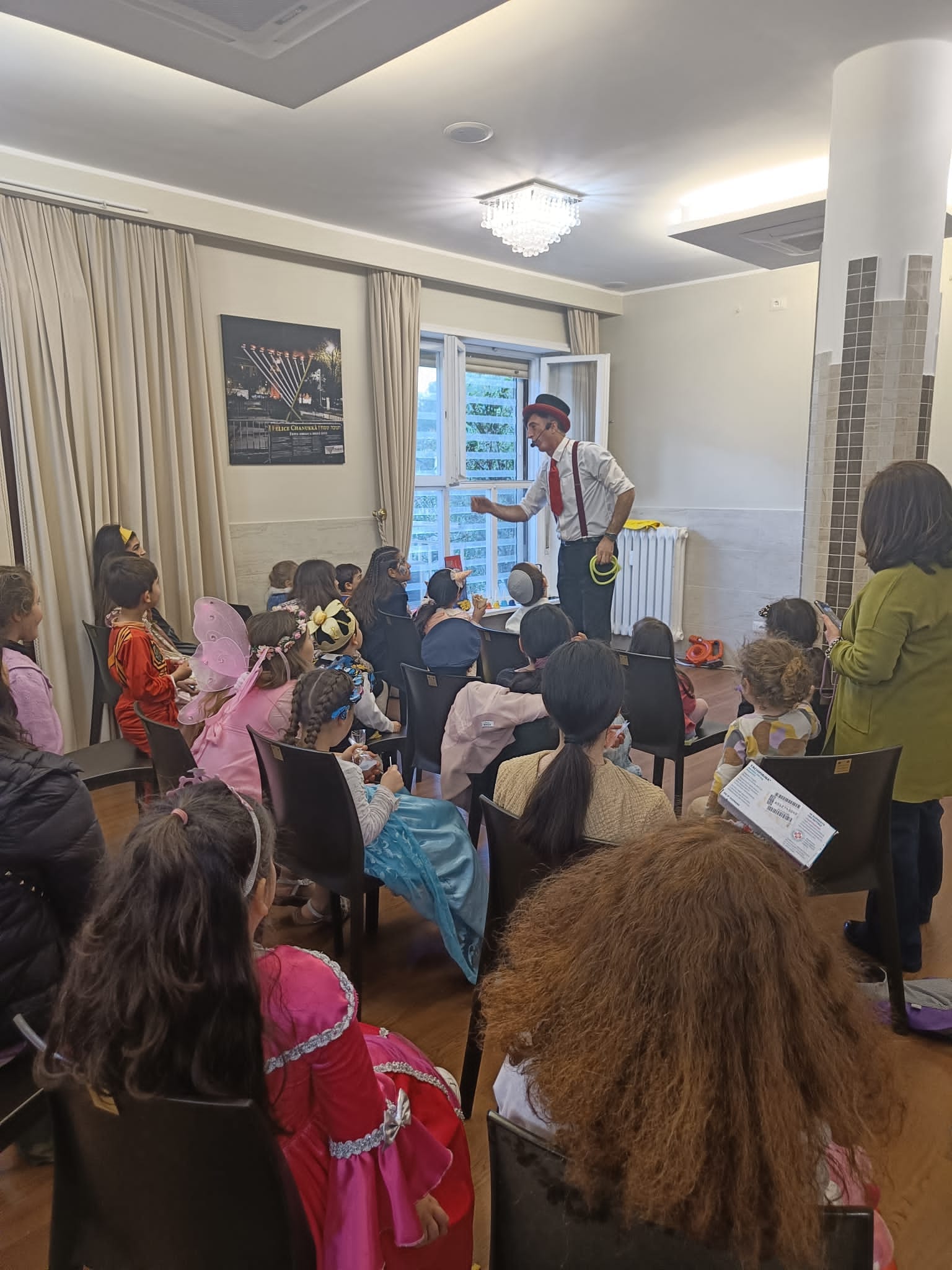 Nel pomeriggio, si è tenuto il Purim nello Shuk, dove le bancarelle offrivano una vasta gamma di cibi, inclusi pita e shwarma o pita e falafel, oltre a burekas, dolci, caramelle, halva e succhi freschi. È stato anche allestito uno spazio dedicato alla pratica delle Mitzvot, dove circa 10 persone hanno avuto l’opportunità di indossare i Tefillin. Per intrattenere i più piccoli, un prestigiatore de “Il Palloncino Colorato” ha presentato una serie di numeri magici, culminando con l’uomo nel palloncino.