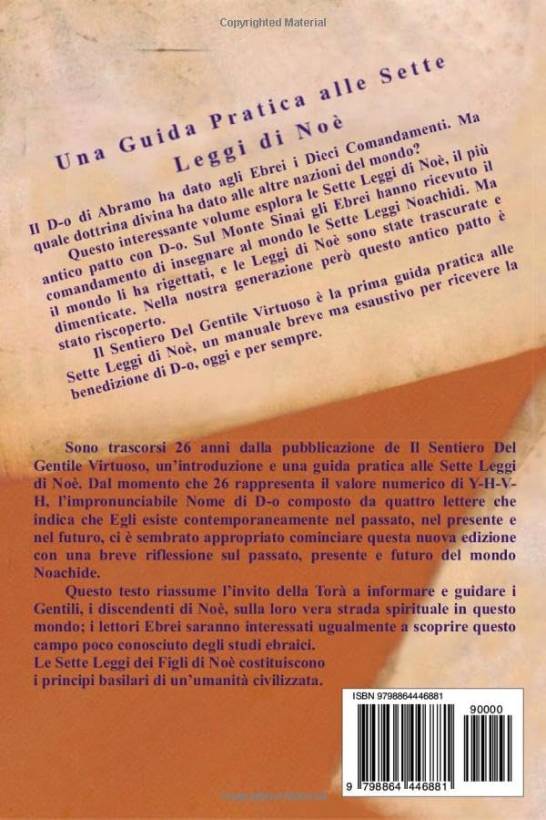 Il D-o di Abramo ha affidato ai figli d’Israele i Dieci Comandamenti e i Cinque Libri di Mosè. Quale Dottrina Divina ha dato alle altre nazioni del mondo? Questo lavoro affascinante e ben studiato esplora le sette leggi di Noè, l’antica alleanza che garantisce a tutta l’umanità il favore e le benedizioni di D-o. Il Sentiero del Gentile Giusto è una sintesi degli insegnamenti ebraici tradizionali sulla vera relazione dei Gentili con D-o e sui loro obblighi reciproci. Gli argomenti esplorati includono: quale patto fece D-o con l’uomo prima del Monte Sinai? Perché gli ebrei credono nel ritorno a D-o piuttosto che nel pentimento? Cosa è considerato un atto di furto? Cosa costituisce idolatria? Come dovrebbe funzionare un vero sistema giudiziario? Il Sentiero del Giusto Gentile è un manuale completo di istruzioni per il successo, oggi, domani e per l’eternità.