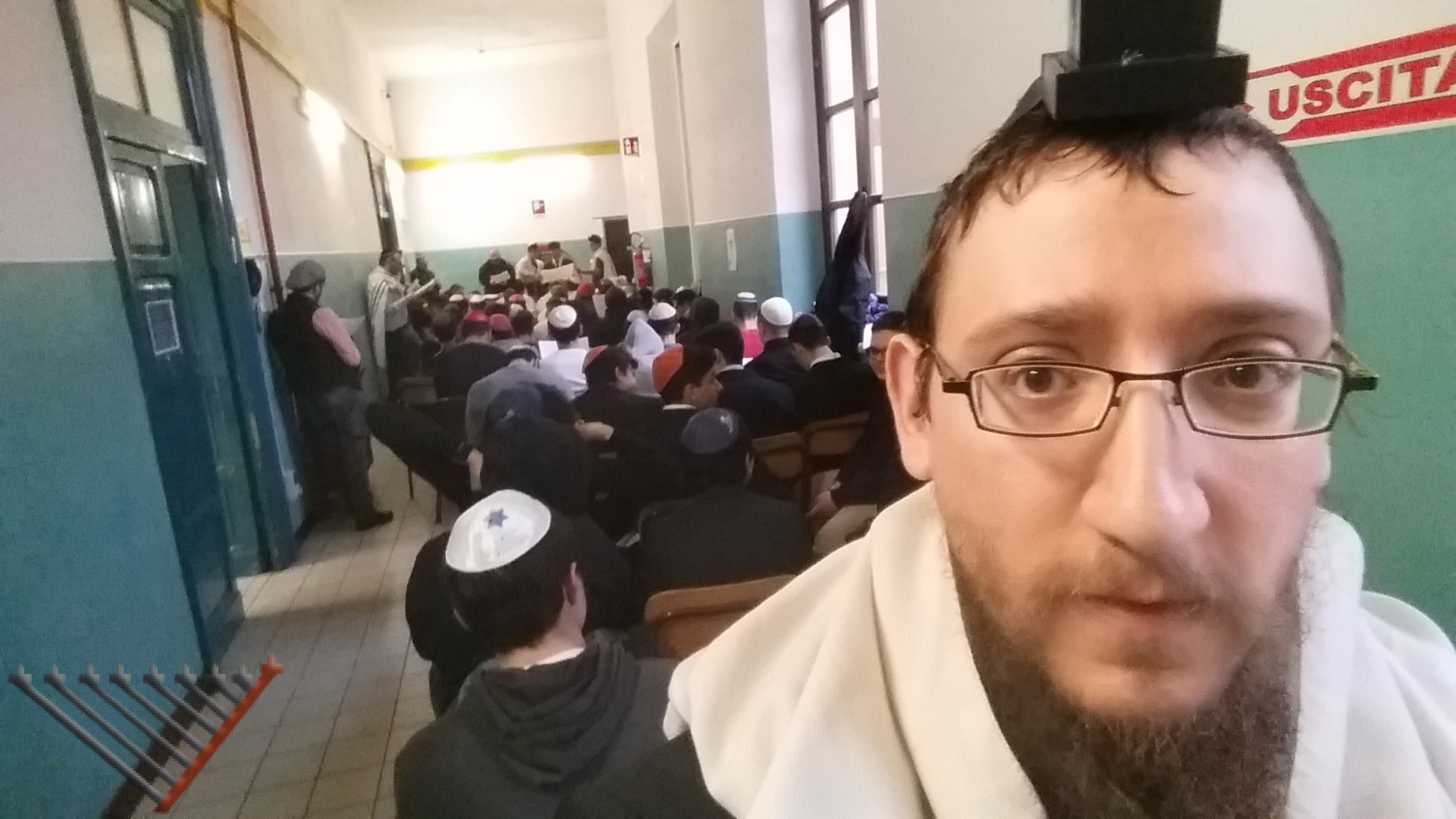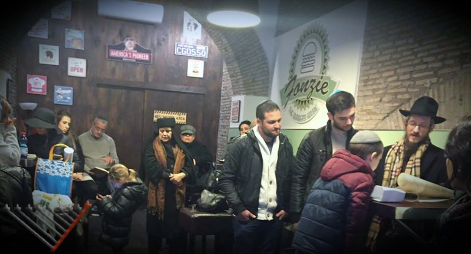 1:30 pm: Like every year, Rabbi Shalom Hazan, director of Chabad of Monteverde, read the Megillah in the Jewish Ghetto, this year at Fonzie, a Kosher fast-food, thanks to the invitation of the owner David Gay.