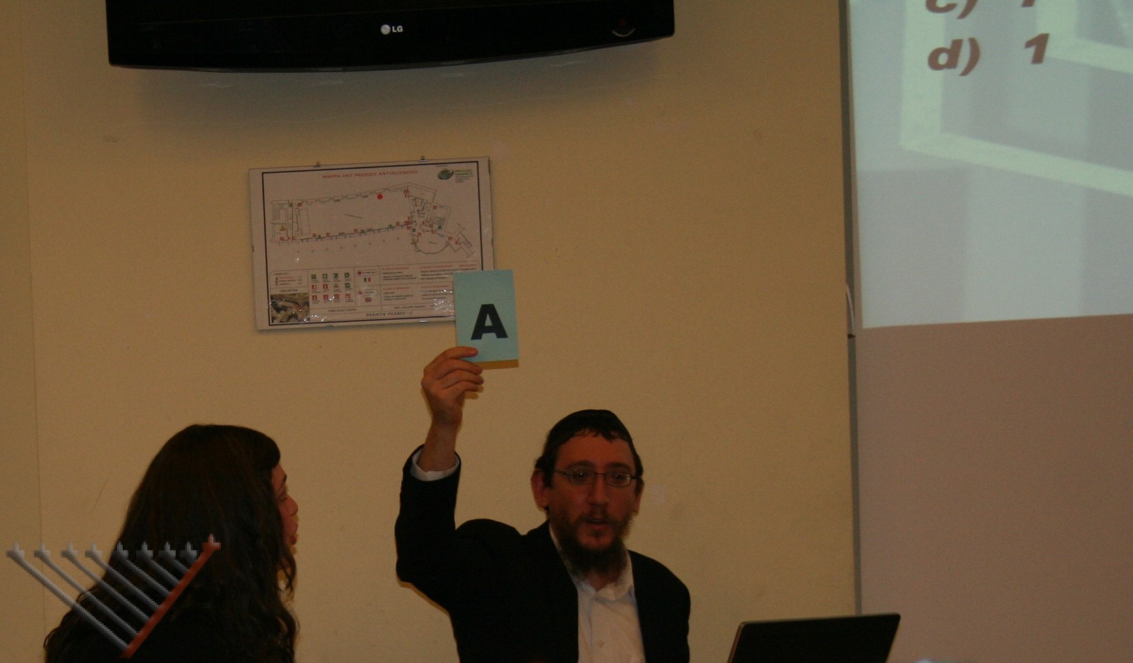 After the initial mingling and eating the students divided in four teams and played “Who wants to be a millionaire” the Chanukah version. The competition was tight but the green team prevailed.